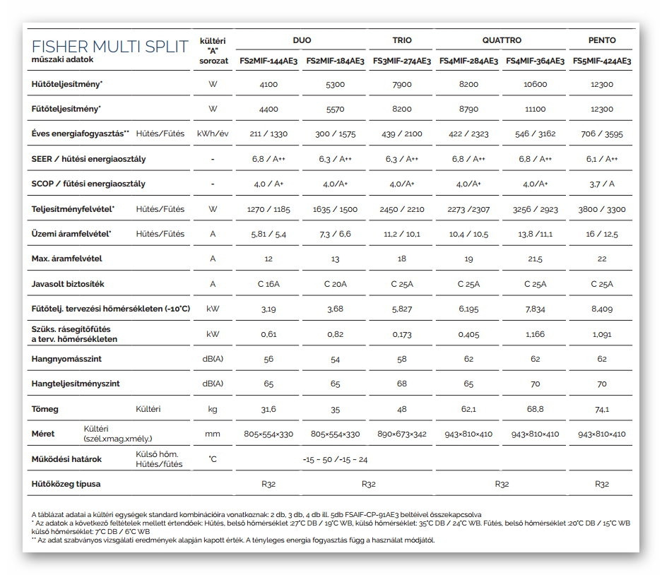 A Fisher FS5MIF-424AE3 Multi klíma kültéri egység (max. 5 beltéri egységhez) fontos tulajdonságai: