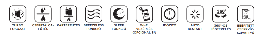 Felszerelés és beüzemelés díja bruttó 45.000 Ft, mely tartalmazza a kiszállást, a készülék helyszínre szállítását, a kültéri és beltéri egység felszerelését, elektromos betáp kiépítését aljzatba max. 5 méterig*, a kültéri tartókonzolt, rögzítő elemeket, a vákuumozást, a berendezés beüzemelését és azzal kapcsolatos dokumentumok kitöltését (pl.: beüzemelési jegyzőkönyv, garanciajegy...), valamint a takarítást.