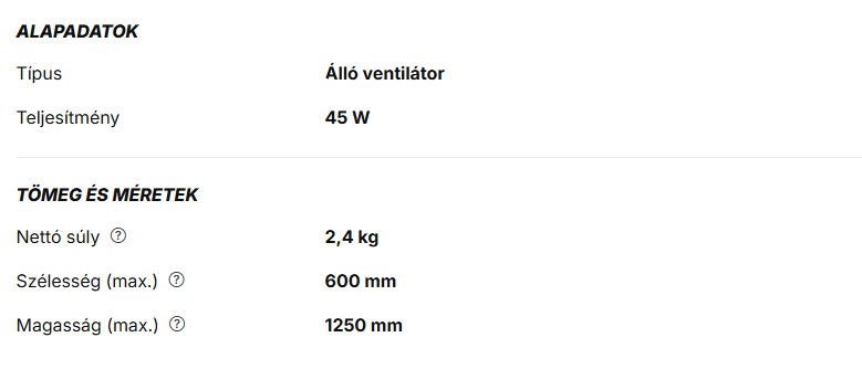 A TOO FANS-40-116-W POLAR fehér, 40 cm, sebességfokozat száma:3, 45 W, álló ventilátor fontos tulajdonságai: